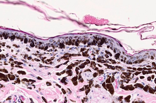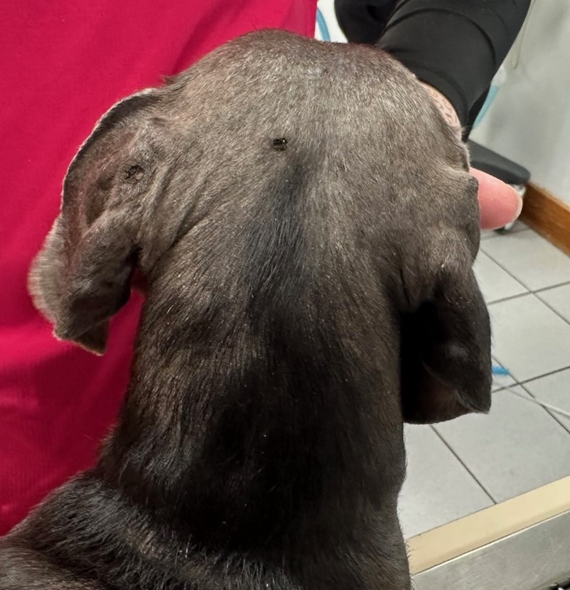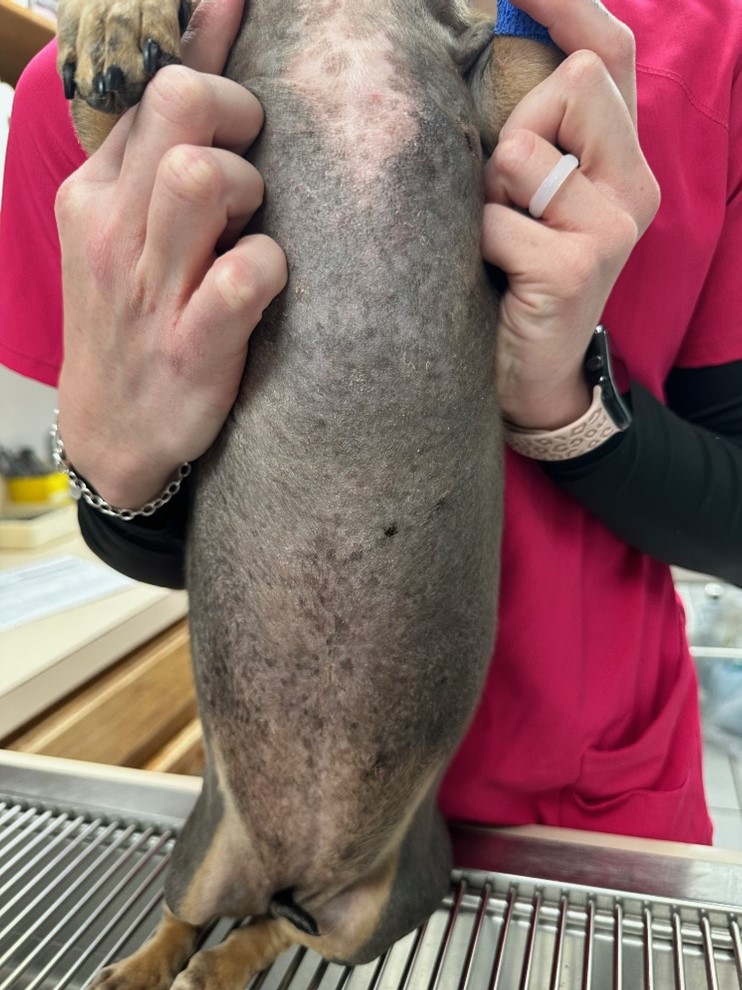 An 11-year-old, spayed female, Dachshund with a blue hair coat color presented with widespread, patchy alopecia. The patient began developing partial alopecia ten years prior on the dorsum. Three years later, the alopecia affected the trunk, and the dorsal back was almost bald. There was no pruritus, pustules, or erythema. After an additional three years, the patient developed seborrhea sicca and erythema. Cytopoint therapy was initiated at that time. The alopecia slowly progressed to the entire body. CBC/chemistry were normal. On presentation, there was partial alopecia with mild, flaky skin and hyperpigmentation, especially on the dorsal skin, as well as numerous small (1-2 mm), raised, black comedones.