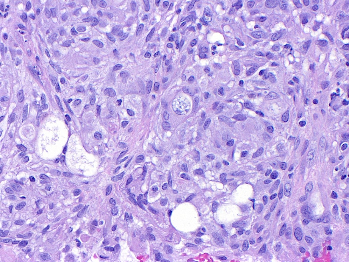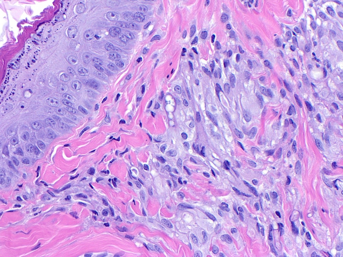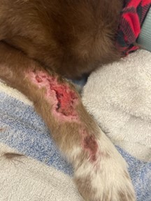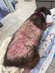 A 7-year-old spayed female Labrador Retriever presented for evaluation of multifocal to coalescing pustular, ulcerative, and crusting skin lesions affecting the trunk (Figure 1) and distal limbs (Figure 2). Some lesions exhibited a foul odor and extended into the subcutis. Skin biopsies were submitted for diagnostic evaluation. The dog had a documented history of pemphigus foliaceus diagnosed several months earlier and was managed by a dermatologist. Long term immunosuppressive therapy included oral prednisone and cyclosporine, with intermittent dose adjustments based on clinical response. The dog also had recurrent deep pyoderma caused by methicillin resistant Staphylococcus spp. and episodes of hepatopathy attributed to chronic medication use.