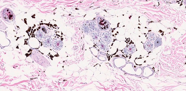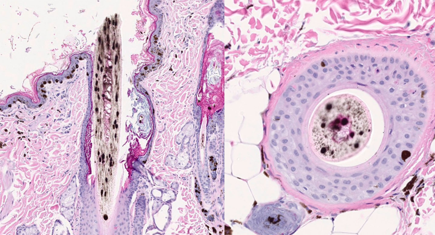 An 11-year-old, spayed female, Dachshund with a blue hair coat color presented with widespread, patchy alopecia. The patient began developing partial alopecia ten years prior on the dorsum. Three years later, the alopecia affected the trunk, and the dorsal back was almost bald. There was no pruritus, pustules, or erythema. After an additional three years, the patient developed seborrhea sicca and erythema. Cytopoint therapy was initiated at that time. The alopecia slowly progressed to the entire body. CBC/chemistry were normal. On presentation, there was partial alopecia with mild, flaky skin and hyperpigmentation, especially on the dorsal skin, as well as numerous small (1-2 mm), raised, black comedones.